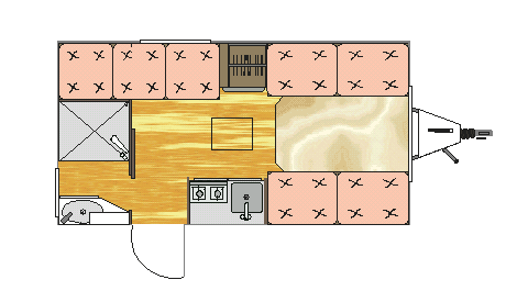 | Banheiro construído a partir de esqueletos de madeira e compensados de virola de 4 mm, revestido com laminado tipo fórmica na cor brilhante, armário com espelho sobre a cuba do gabinete, com ducha para o banho e piso em aço inox. Móveis embutidos no próprio trailer, construídos a partir de esqueletos de madeira e compensado de 4 mm em cerejeira com aplicação de seladora, sendo uma beliche de solteiro com a cama de cima dobrável formando um sofá na parte de baixo, uma cama de casal desmontável formando uma mesa para as refeições, espumas de densidade 40 revestidas com tecido de ótima qualidade. Fogão de duas bocas com forno, pia com torneira embutida no gabinete e armário. Uma janela de acrílico leitoso pequena no banheiro, uma janela de acrílico fumê pequena no beliche superior, uma janela de acrílico fumê média na parte dianteira. | |||||||||||||