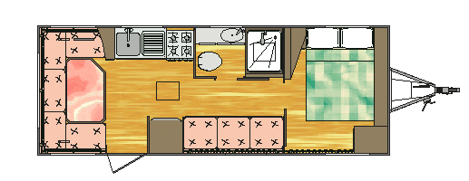 em forma de "C" na parte traseira do trailer, com baú e armário